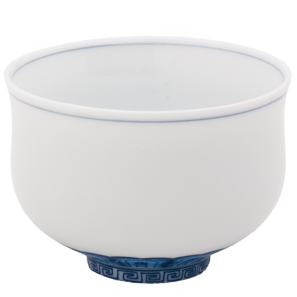 Tall white teacup with traditional blue motifs and small calligraphy.