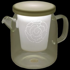 Skleněná konvička s porcelánovým víčkem a sítkem.