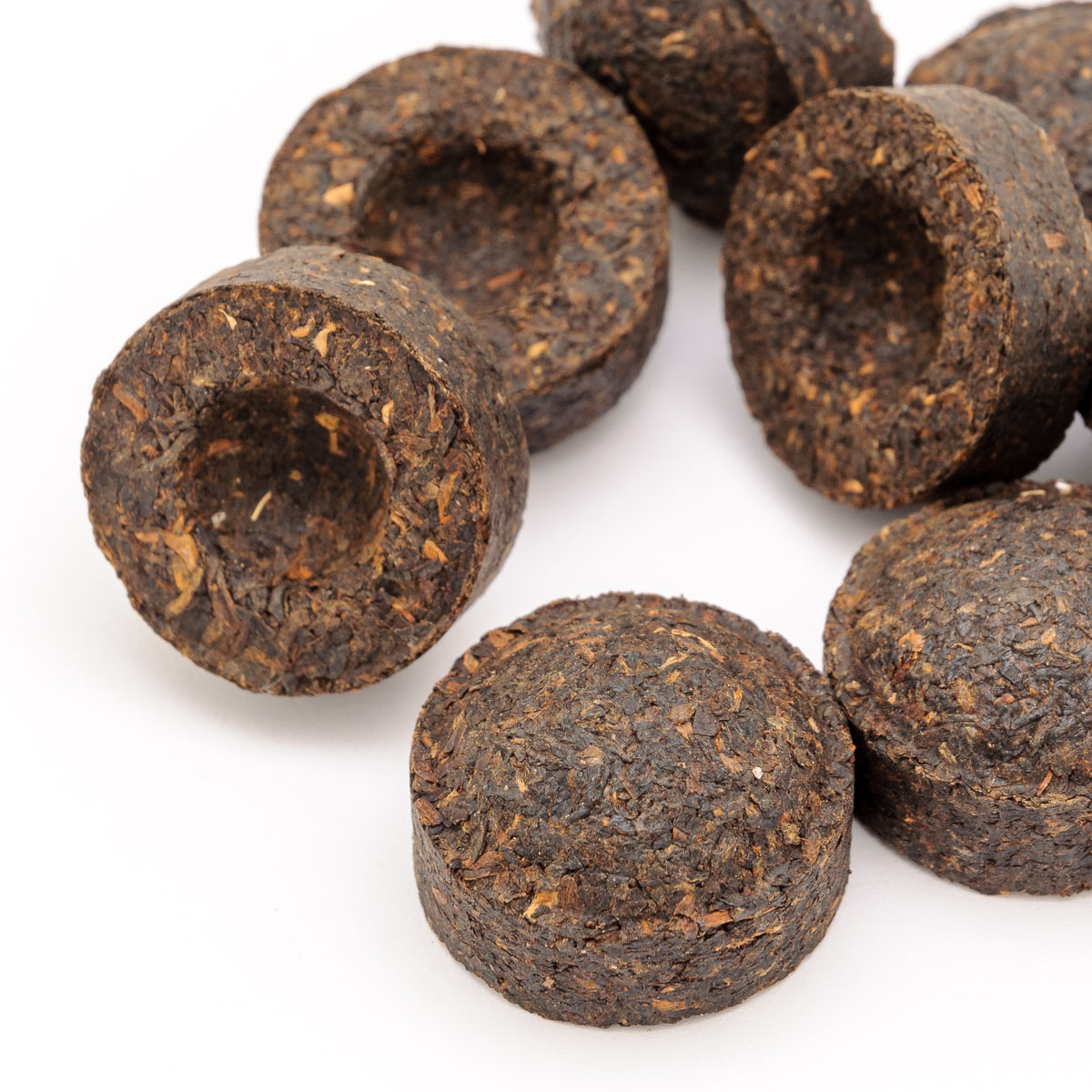 Tmavý pu-erh základní kvality lisovaný do 5-6g hnízdeček, zabalených v jemném papíru.