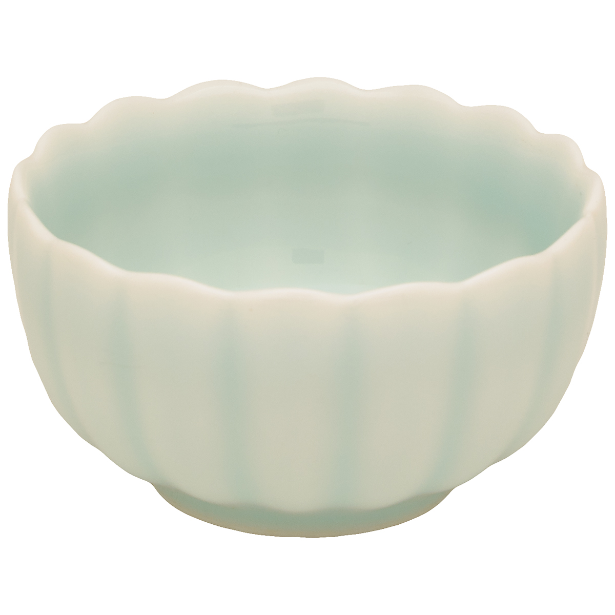 Světle modrozelený šálek ve tvaru chryzantémového květu.