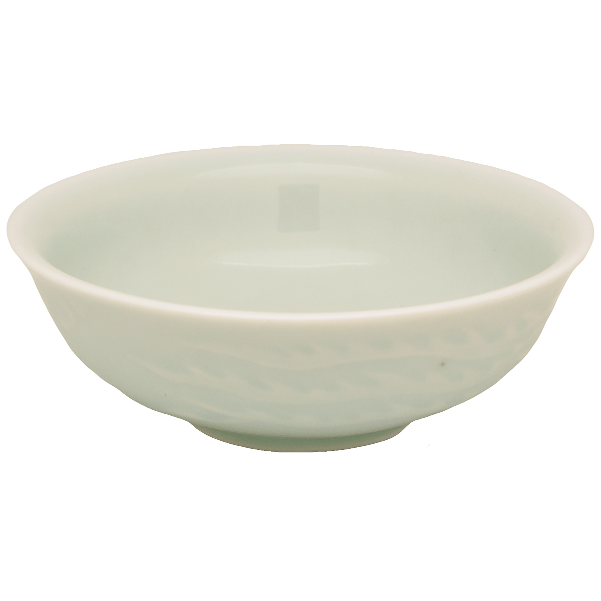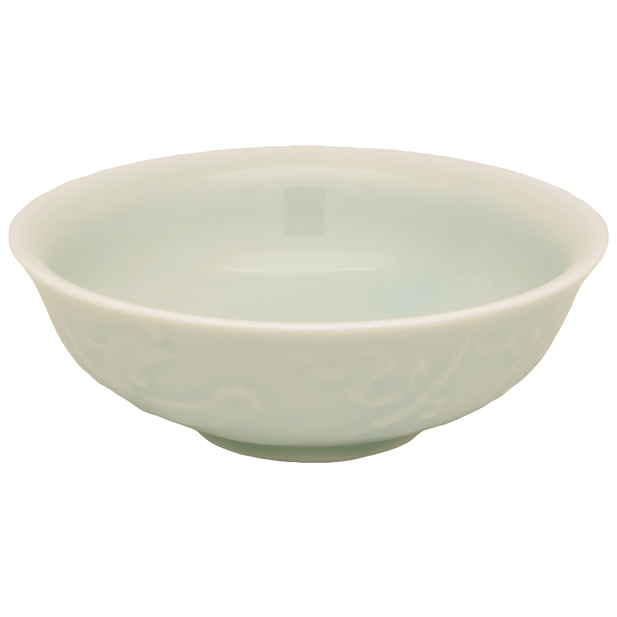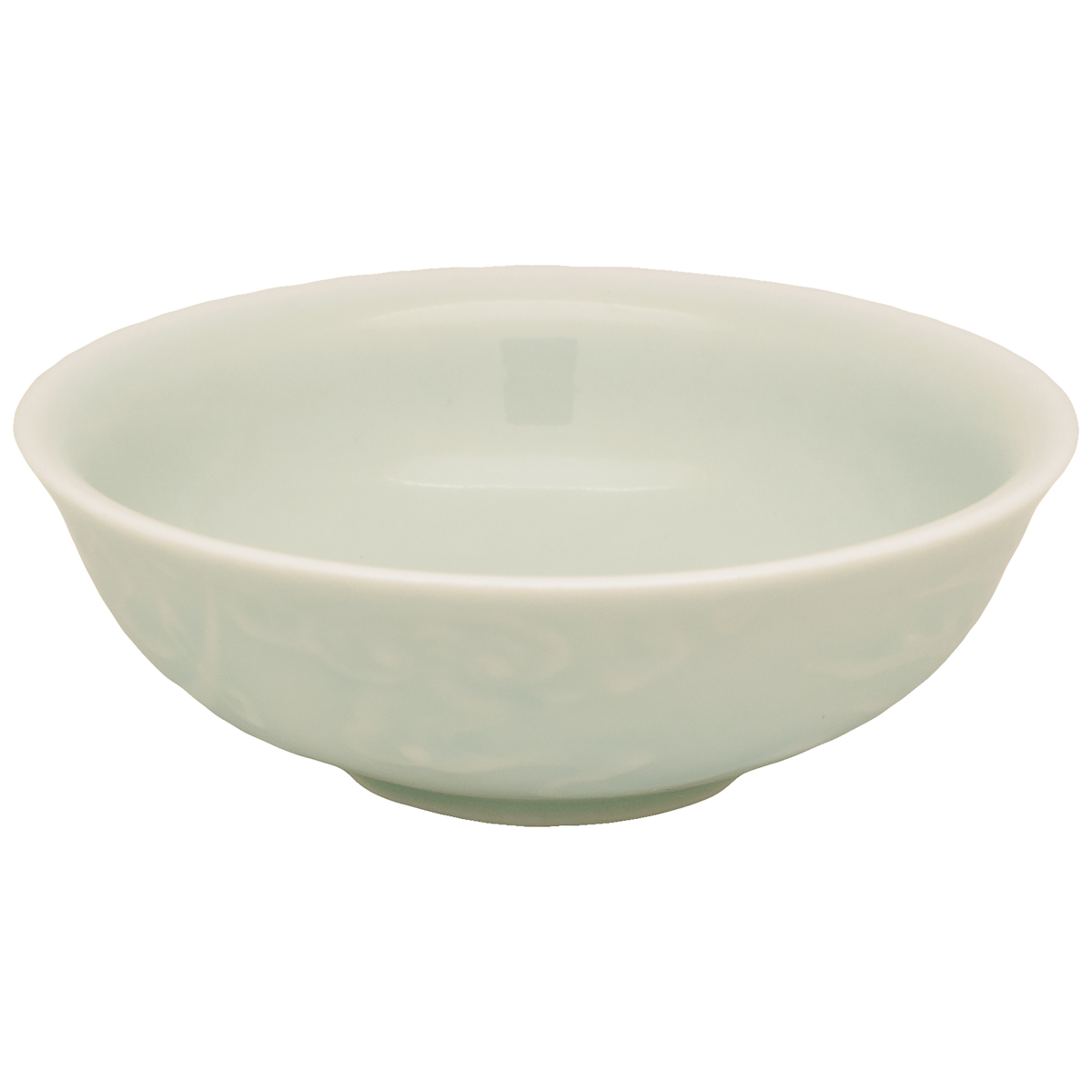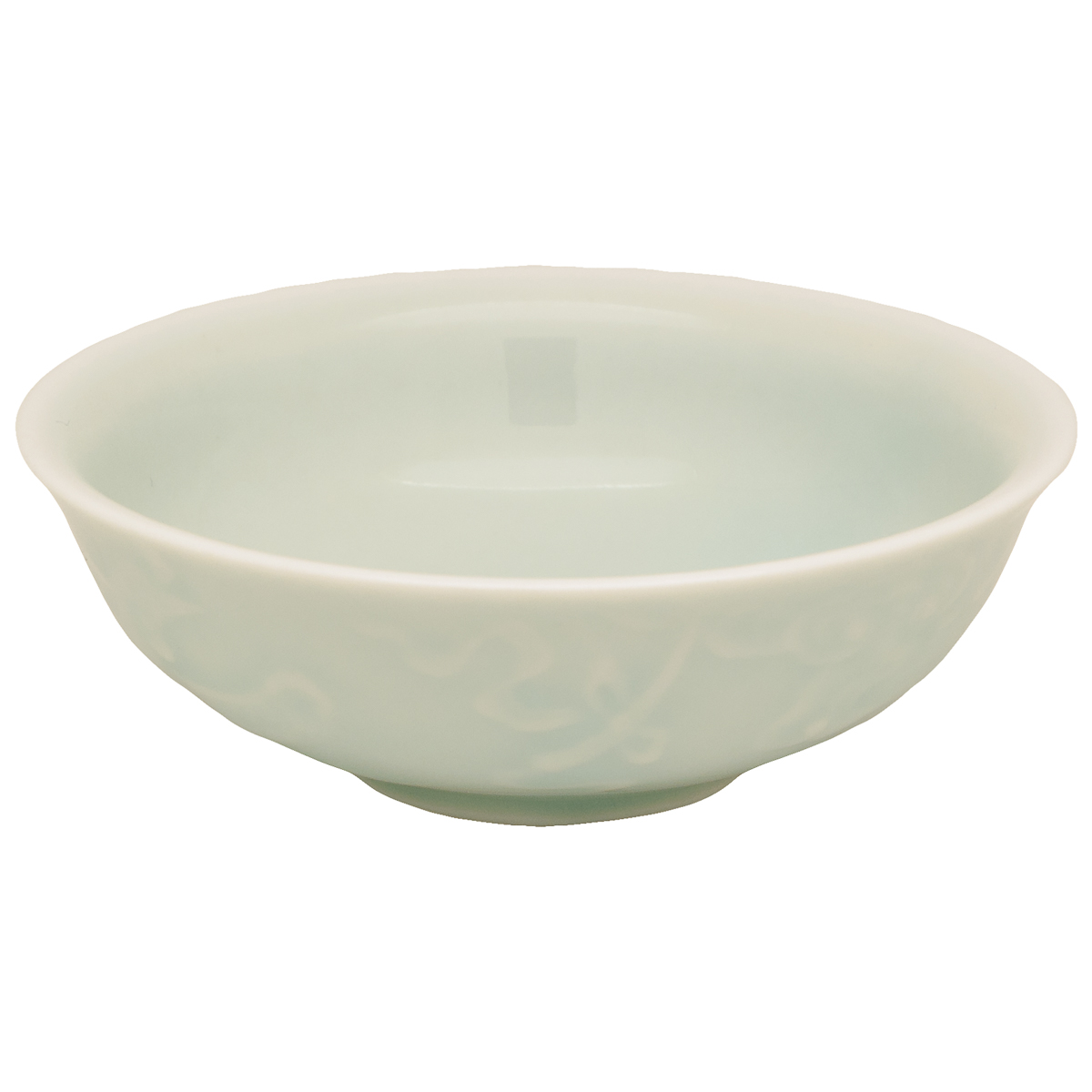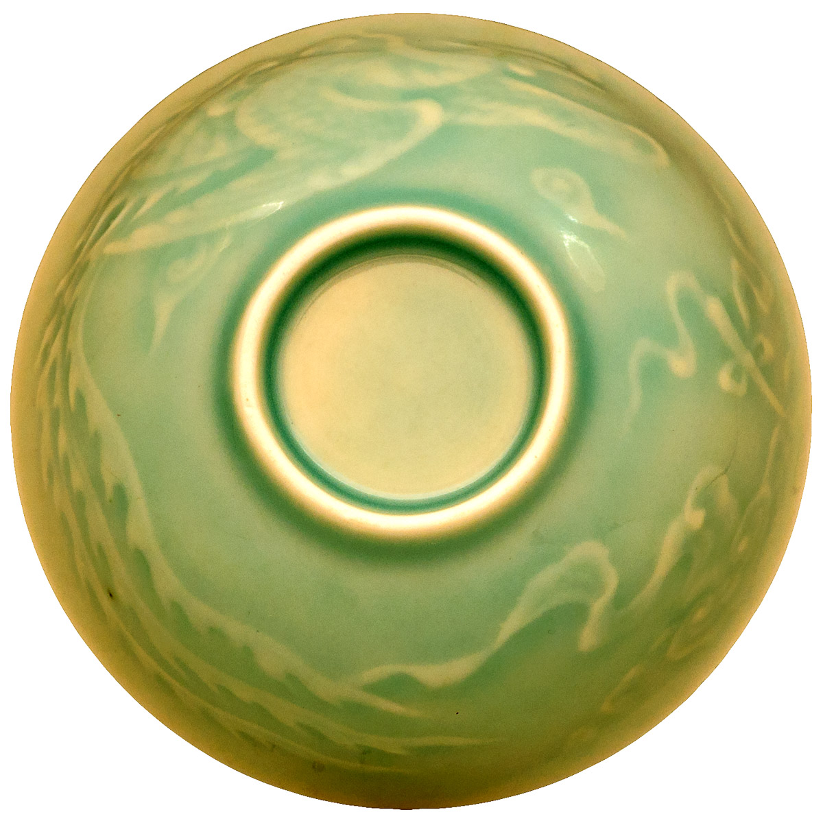 Světle modrozelená průsvitná miska s reliéfním dekorem fénixe. Historicky ji používaly dámy. Párová miska s drakem.