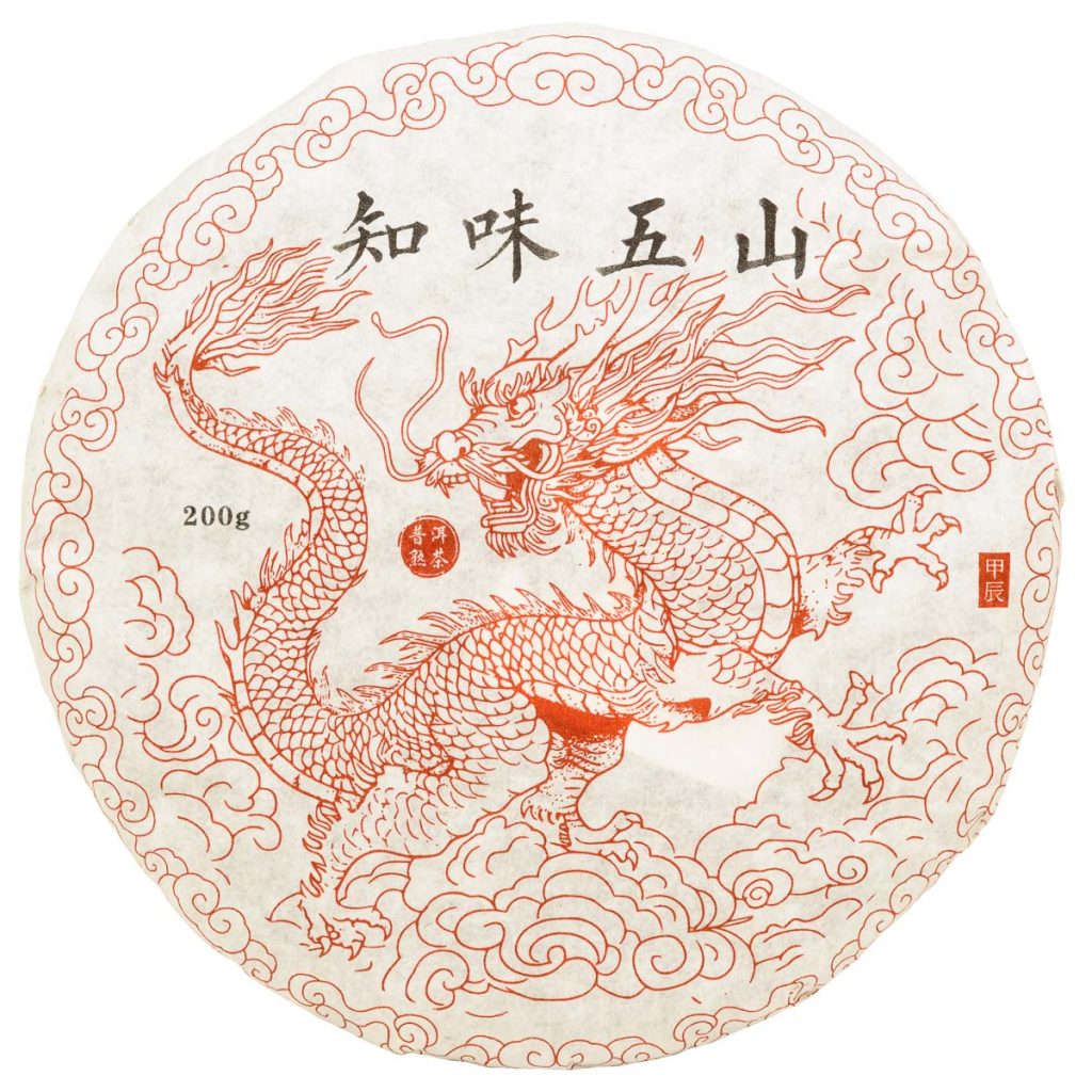 Zhi Wei Wu Shan 知味五山: „Poznej chuť pěti hor“ je prémiový mix pu-erhů z pěti slavných hor. Expertně namícháno pro docílení unikátního chuťového profilu. Drak na obalu odráží rok dřevěného draka, kdy byly koláče lisovány a baleny.