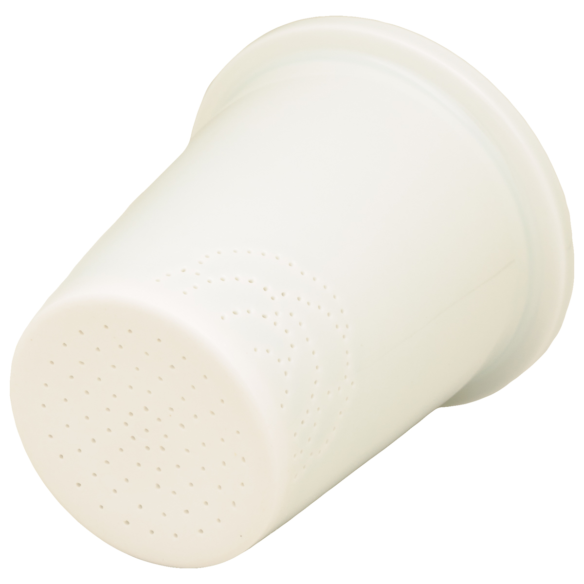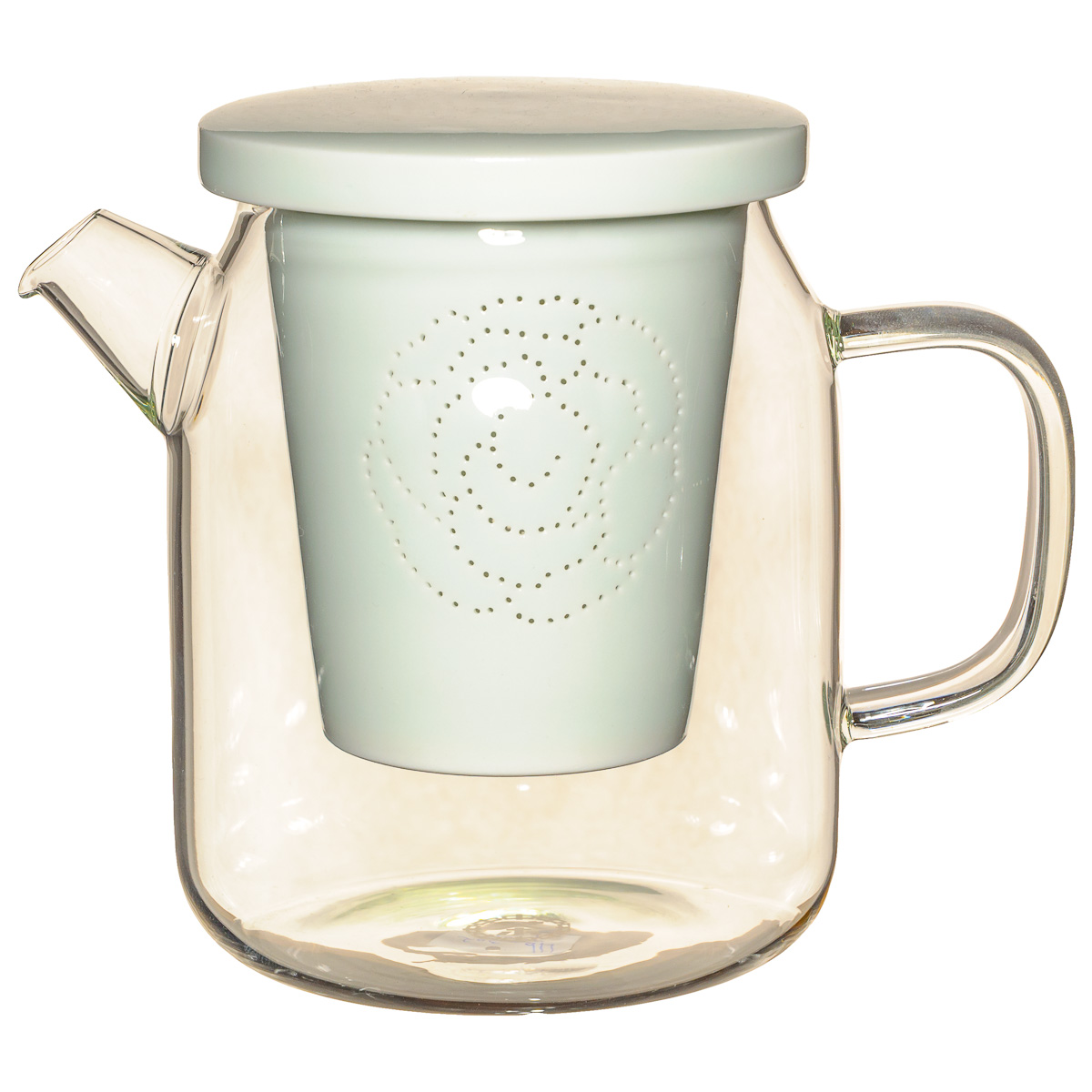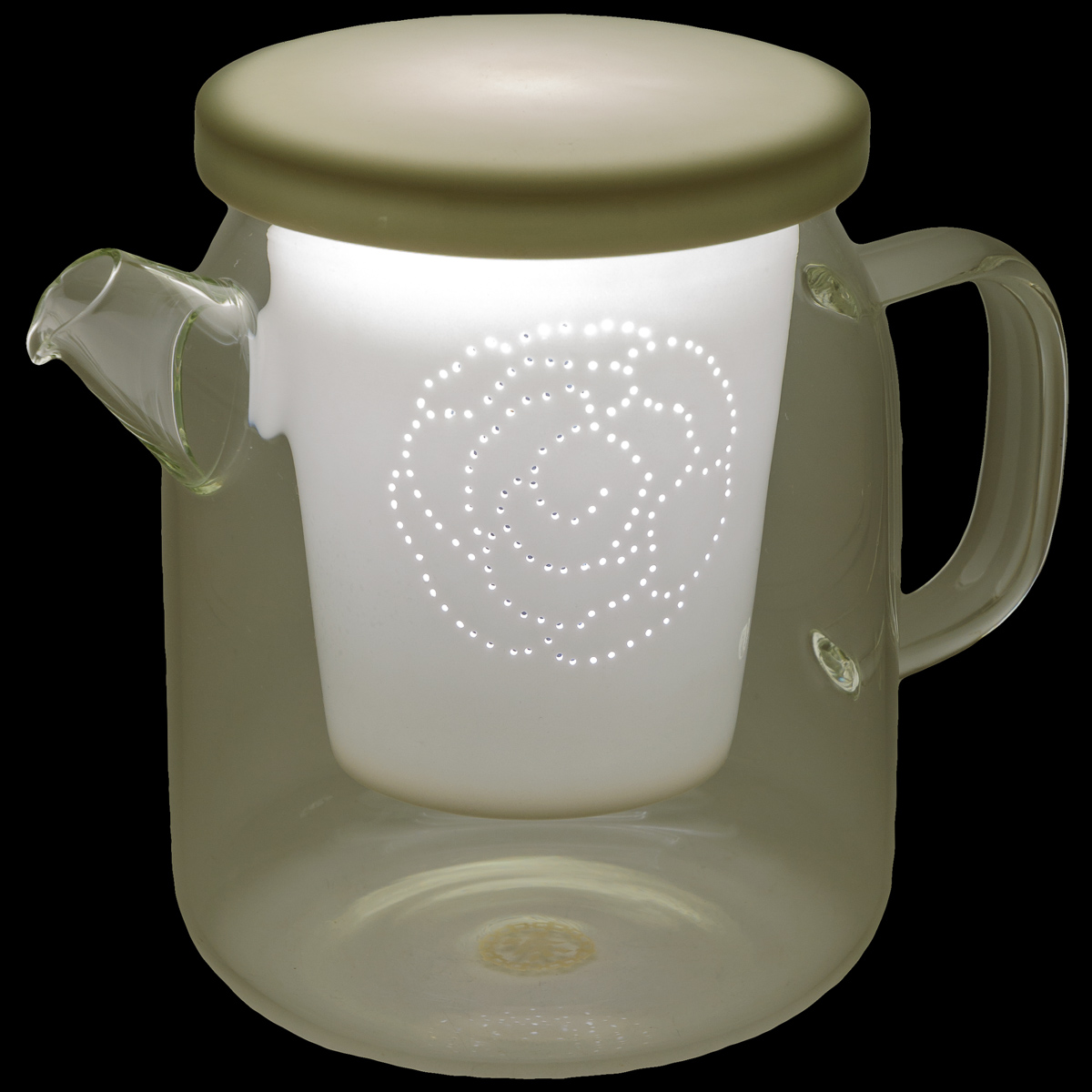 Skleněná konvička s porcelánovým víčkem a sítkem.