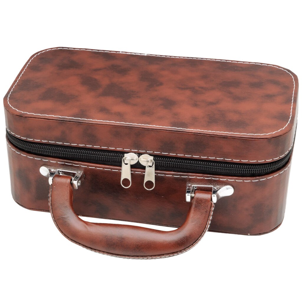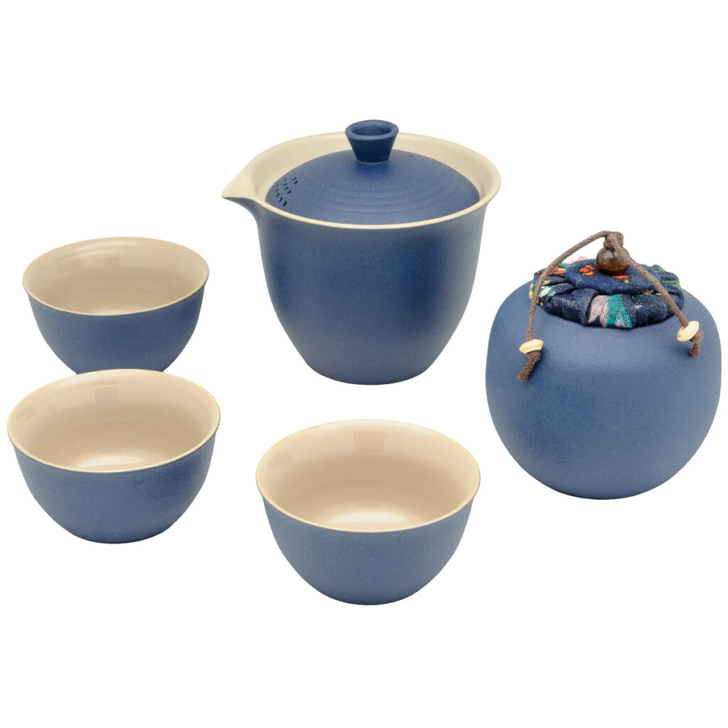 Cestovní souprava tmavě modrého zhongu, třech šálků a malé dózy na čaj. Praktický cestovní obal/kufřík s pěnovou výplní.