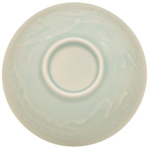 Světle modrozelená průsvitná miska s reliéfním dekorem fénixe. Historicky ji používaly dámy. Párová miska s drakem.
